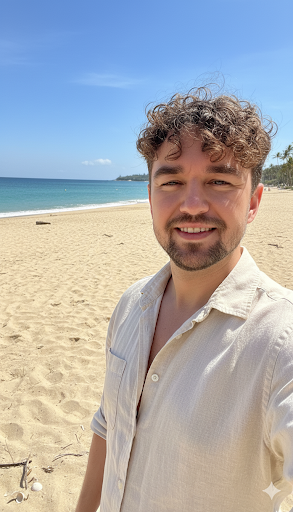 <Bearbeite das Bild und platziere die Person an einem Strand. AuĂźerdem Hemd statt Rollkragen.>