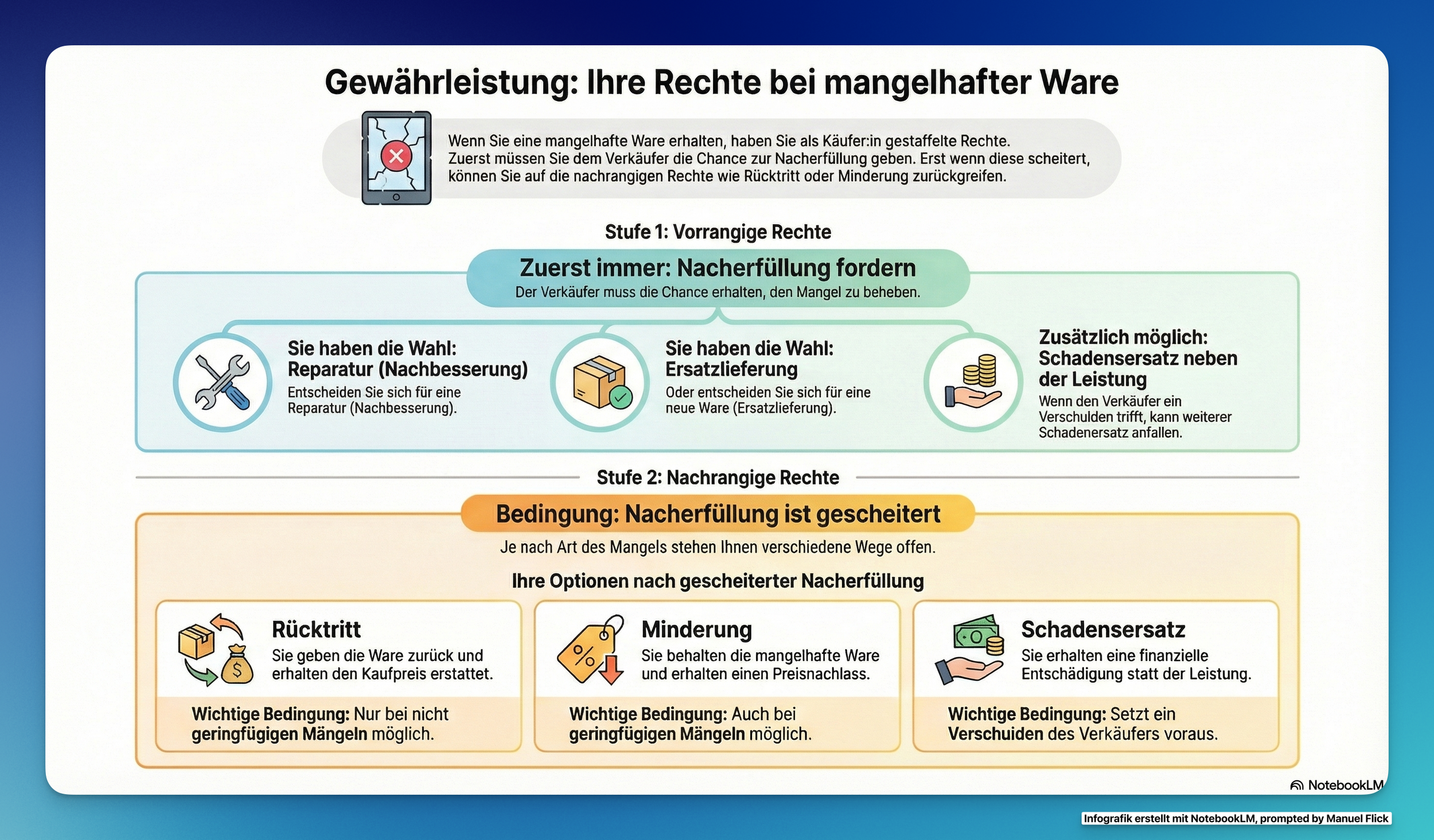 Hier ein Beispiel zu einem meiner aktuellen Unterrichtsthemen. Die nachfolgende Infografik zum Thema Gewährleistung habe ich ohne weitere Angaben auf Basis meines Unterrichtsmaterials erstellt: