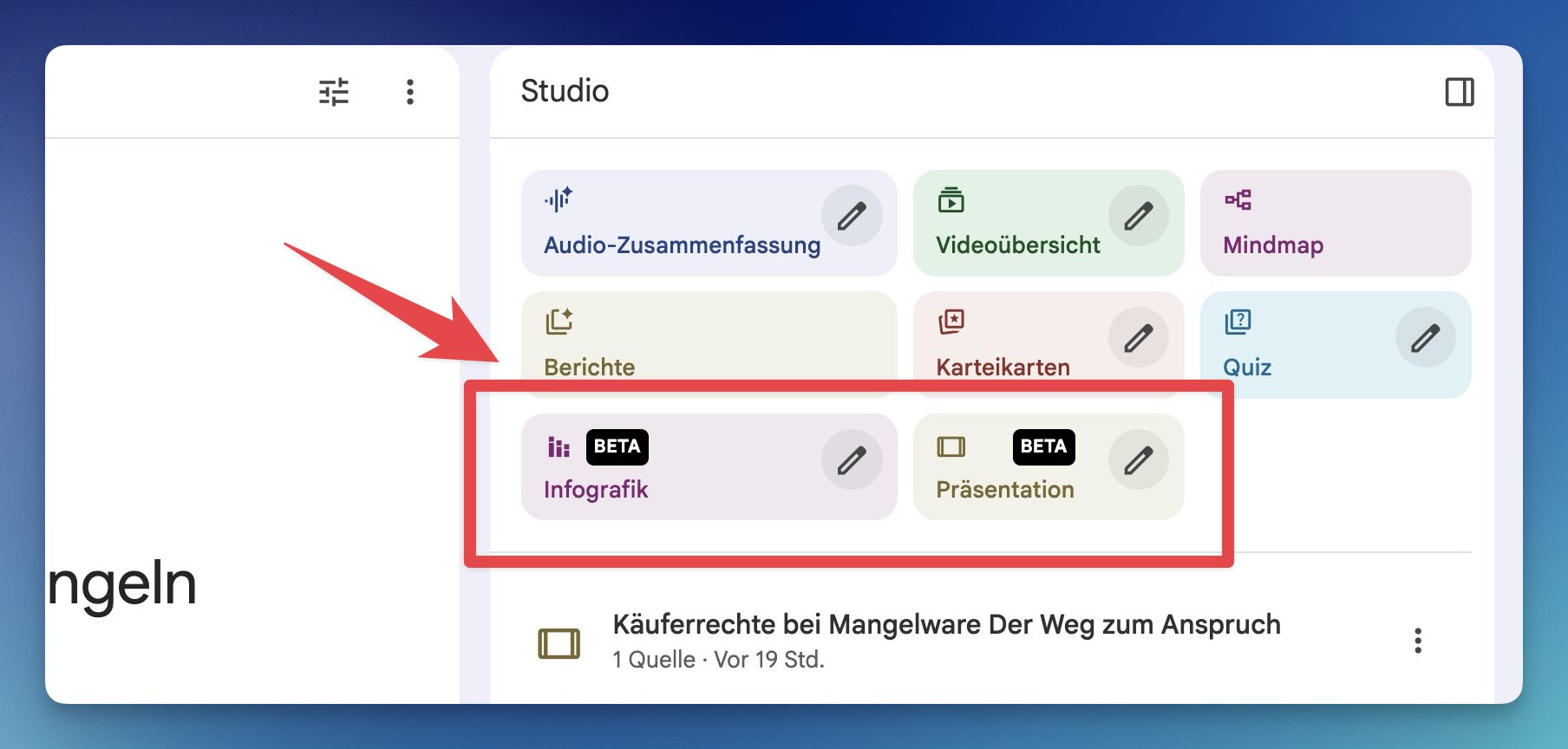 Im letzten Newlsetter habe ich euch davon berichtet, dass NotebookLM jetzt auch Lernkarten und Quizze erstellt. Jetzt wurde der Funktionsumfang erneut erweitert. Aus eurem Material lassen sich nun zusätzlich Präsentationen und Infografiken erstellen.
